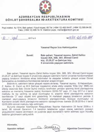 Yasamal Rayon İH-nin şöbə müdiri Şahin Məmmədov mətbuata müsahibə verərək həyətdə 14 mərtəbəli binanın tikiləcəyini bəyan etmişdir. В«Elit CityВ» MMC-nin rəhbərliyi, Sizin və müxtəlif yüksək vəzifəli şəxslərin adlarını çəkərək, guya, həyətdə bina tikilməsinin В«yuxarılardanВ» tapşırıldığına dair təəssüratlar yaratmağa, bununla öz qanunsuz əməllərini pərdələməyə çalışırlar. Sakinlərin məlumatı olmadan onların adından müxtəlif ünvanlara müraciətlər göndərərək, guya, binanın tikintisinə razı olduğumuza dair yanlış məlumat verirlər.
