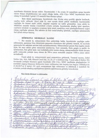Biz əminik ki, müraciətimiz Sizə çatdırıldığı halda, həyətimizdə yaşıllığın məhv edilməsinin, qanunsuz bina tikintisinin qarşısının alınmasına dair göstəriş verəcək, öz xeyirxah qərarınızla biz sakinləri növbəti dəfə sevindirəcəksiniz. Müraciətimizi şəxsən Sizə təqdim etmək üçün, bir neçə sakini qəbul etməyinizi arzulayırıq. Eyni zamanda, Sizin gərgin iş qrafiki ilə işləməyinizi, bizi qəbul üçün vaxt məhdudiyyətini nəzərə alaraq, nümayəndənizin bizim ünvana gəlib vəziyyətlə yerində tanış olması da 300-ə yaxın mənzildə yaşayan 1500-ə yaxın sakini sevindirərdi.”