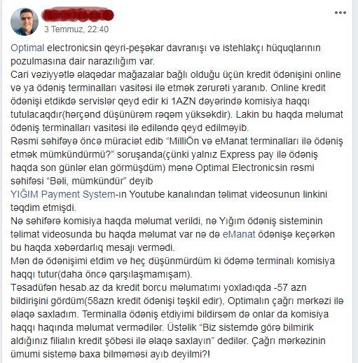 Belə olan zaman sözügedən mağazalarla müştəri arasında problemlər yaşanır. Belə ki, mağaza defekt malı dəyişmək istəmir. Təmir edərək müştəriyə qaytarmaq istəyir. Bu isə qanunsuz hesab olunur. Çünki malın defekt olduğu alınan günü ortalığa çıxıbsa, rəhbərlik məhsulu dəyişməlidir. Təəssüf ki, bir sıra işbazlar bundan boyun qaçırmağa çalışırlar. Lakin istehlakçı hüquqlarını yaxşı bilənlər haqlarını tələb edə bilirlər. Hüquqlarından bixəbər olanlar isə bundan yararlana bilmirlər. Bundan başqa bizə verilən məlumata görə, “Optimal Electronics” Mağazalar Şəbəkəsində kredit şöbəsində vətəndaşlar incidilir. Belə ki, müştəri bir gün ödənişi gecikdirən kimi vətəndaşdan artıq pul alınır.