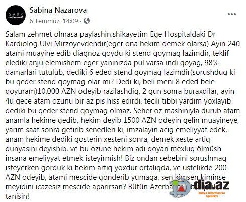 "Şikayətim "Ege Hospital"da çalışan Dr.Kardioloq Ülvi Mirzoyevdəndir... Əgər ona həkim demək olarsa... Keçən ayın 24-ü atamı müayinə edib diaqnoz qoydu ki stend qoymaq lazımdır. Təklif etdi ki, anju eləmişəm, əgər yanınızda pul varsa, indi qoyaq, 98% damarları tutulub. Dedi ki, 6 ədəd stend qoymaq lazımdır.