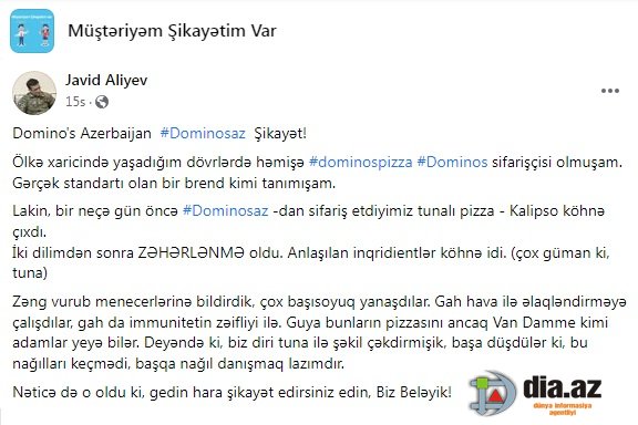 DİA.AZ: - "Ölkə xaricində yaşadığım dövrlərdə həmişə "Dominos Pizza" sifarişçisi olmuşam. Gərçək standartı olan bir brend kimi tanımışam". DİA.AZ bildirir ki, bu barədə "Müştəriyəm Şikayətim Var" sosial qrupundakı paylaşımında Cavid Əliyev adlı istifadəçi giley edir.