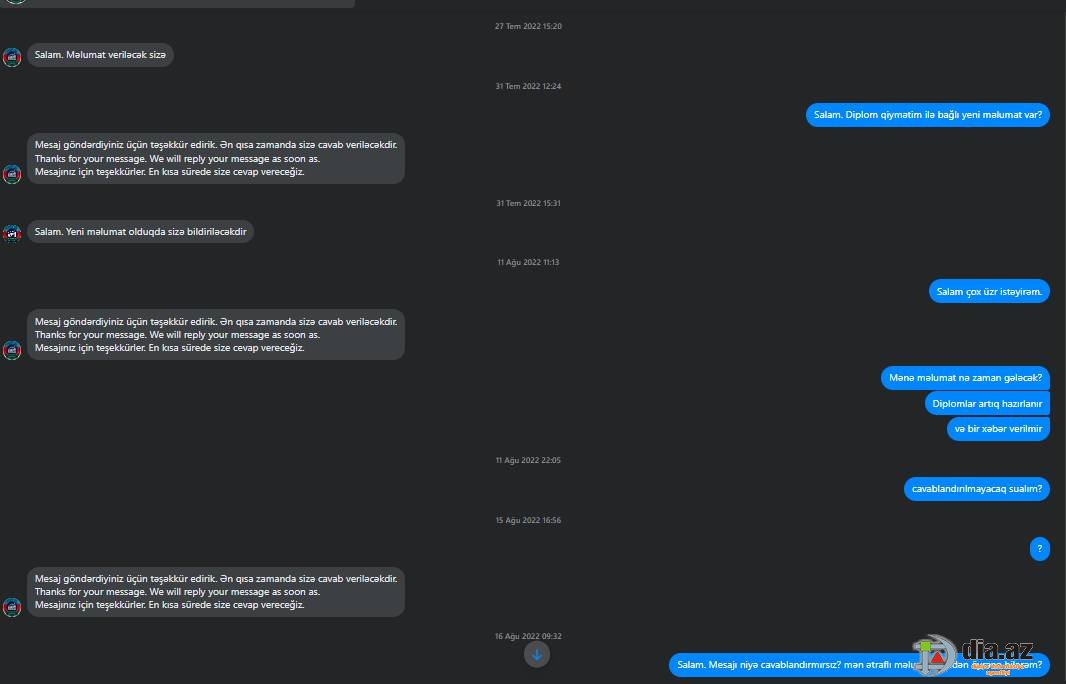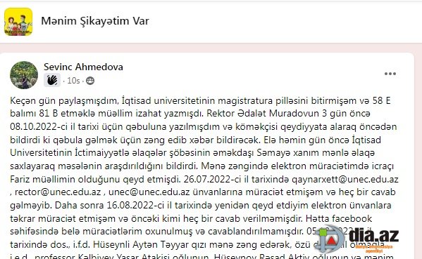 DİA.AZ: - Keçən günlərdə Sevin Əhmədova adlı şikayətçinin təhsil aldığı ali məktəb barəsində gileyini təqdim etmişdik: