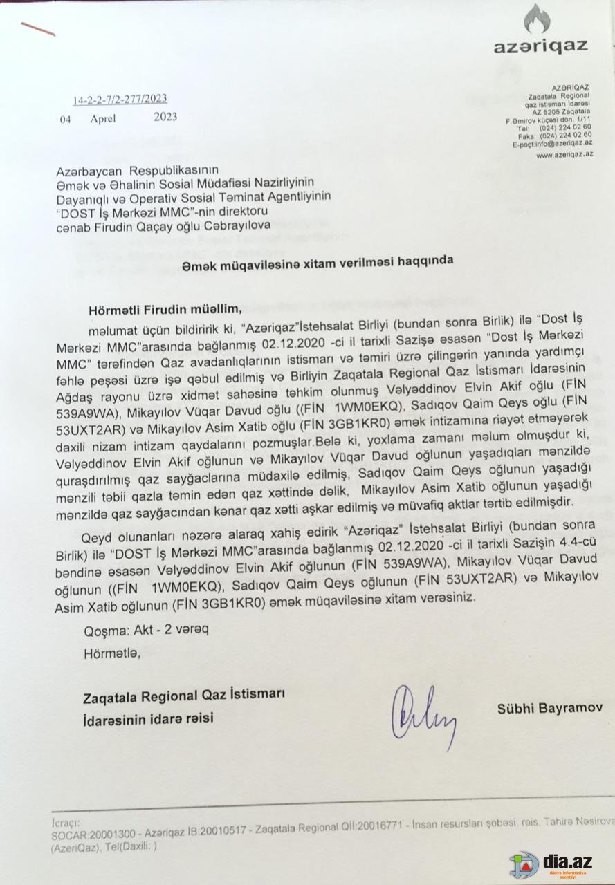 Bununla əlaqadar Əmək və Əhalinin Sosial Müdafiəsi Nazirliyinin Dayanıqlı və Operativ Sosial Təminat Agentliyinin "DOST İş Mərkəzi-nin direktoru Firudin Cəbrayılova təqdimat yazıb".