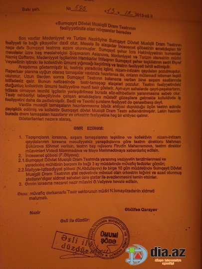 Əks halda 13.12.2013-cü il tarixində nazirlikdən gələn əmrdə mənim qaldırdığım ittihamlar, təqdim etdiyim faktlar da ehtiva olunardı. Amma bu haqda əmrdə ümumiyyətlə, heç bir məlumat yoxdur. Təəccüblüsü odur ki, son 17 il ərzində nazirliyə gələn bütün yoxlamalar zamanı heç bir qanun pozuntusu aşkar edilməyib. O cümlədən teatrda heç bir fəaliyyəti olmayan böyük bir orkestrin saxlanması faktı da kimsənin diqqətini cəlb etməyib.
