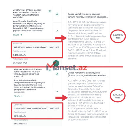 Məlumata görə, Agentliyin tabeliyində olan Heyvan Sağlamlığı və Baytarlıq Xidmətləri Mərkəzi üçün Dabaq (A.O. SAT 2, A.O. Asiya 1, Sat 2) xəstəliyinə qarşı peyvənd vasitələrinin alınmasına başlanılıb.