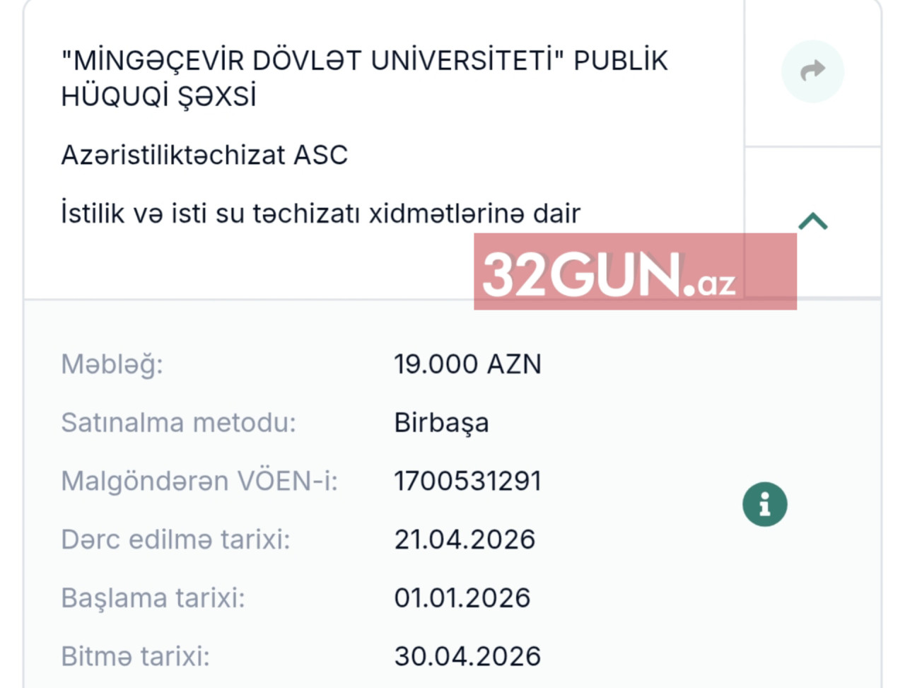 Mingəçevir Dövlət Universiteti "Azəristiliktəchizat" ASC ilə bağladığı 19.000 AZN-lik istilik və isti su təchizatı müqaviləsini elektron portalda (e-tender.gov.az) dərc edib.