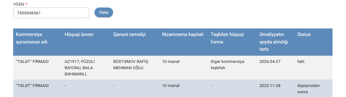 Cəmi 10 manatlıq nizamnamə kapitalı ilə qeydiyyatdan keçmiş firmanın hüquqi ünvanı Füzuli rayonunun Bala Bəhmənli kəndi olaraq göstərilib.