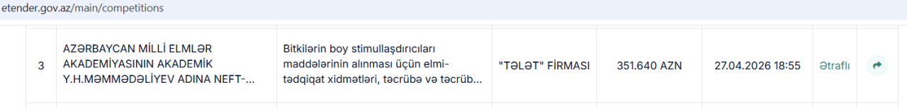 Azərbaycan Milli Elmlər Akademiyasının (AMEA) tərkibindəki aparıcı elmi mərkəzlərdən biri olan Neft-Kimya Prosesləri İnstitutu bitkilərin boy stimullaşdırıcılarının alınması üçün elmi-tədqiqat xidmətləri, təcrübə-sınaq işlərinin aparılması və sınaq partiyalarının tədarükü məqsədilə "Tələt" firması ilə müqavilə bağlamağa hazırlaşır.