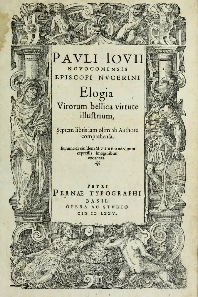 Sizlərə maraqlı bir kitab təqdim edirəm. İlk nəşri 1551-ci ildə çap edilib. Əldəki nüsxə portretli və bəzəkli nəşrdir – 1575-ci ilə aid. Kitabın latınca adı: "Elogia virorum bellica virtute illustrium". Tərcümədə: "Hərbi şücaətləri ilə məşhur olan kişilərin tərifi". Müəllif İtalyanın nüfuzlu tarixçilərindən Paolo Gioviodur. Rəsmlərin müəllifi isə Tobias Stimmer.