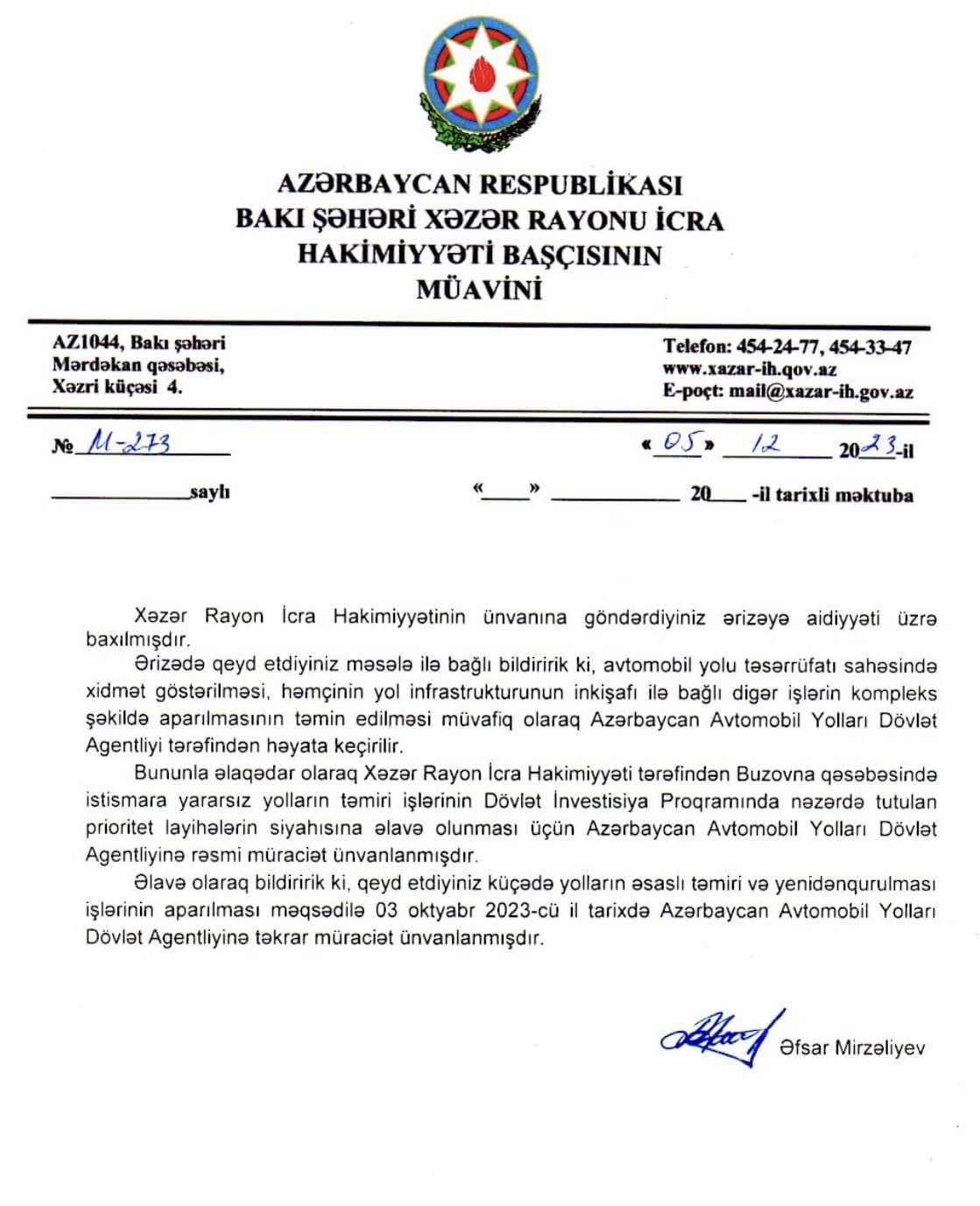 Hətta sözügedən yol icra hakimiyyətinin balansında olmadığı təqdirdə belə vətəndaşın şikayət məktubunu vətəndaşın özü yox, elə İCRA HAKİMİYYƏTİ yönləndirməli idi əlaqədar bildiyi qurumun ünvanına... Buna belə ərinən Xəzər RİH əslində vəzifəsinin icrasından boyun qaçırır ki, buna görə də məsuliyyət yükü var...
