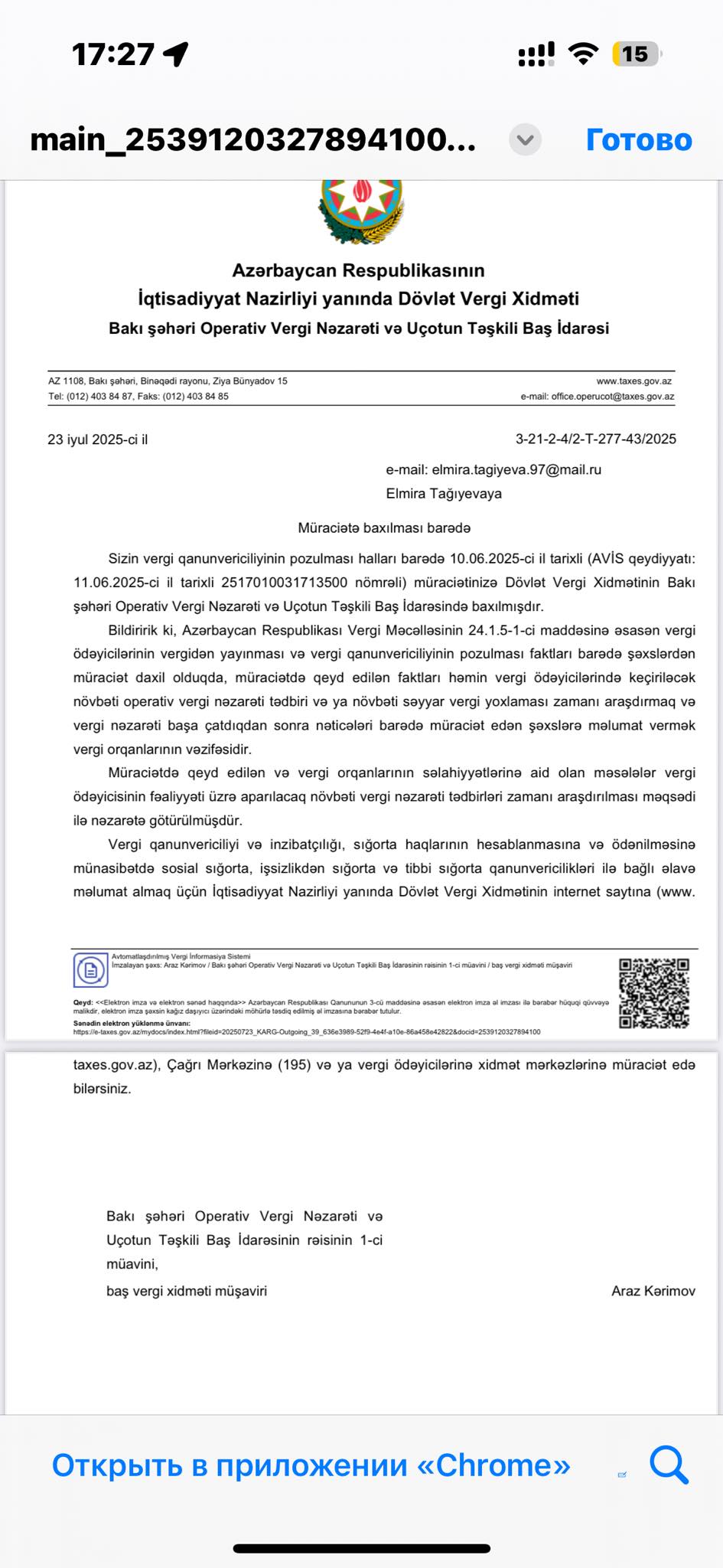 Bu məsələ ilə bağlı Vergilər Nazirliyinə şikayət etdim. 1 ay sonra sadə bir cavab aldım – “növbəti yoxlamalarda mağazaya baxış keçiriləcək”.