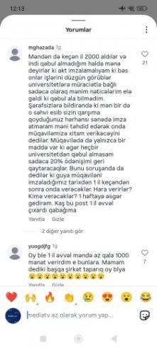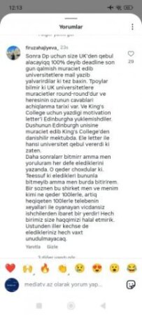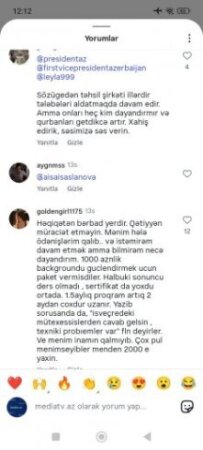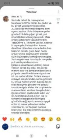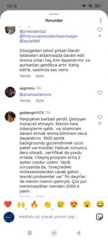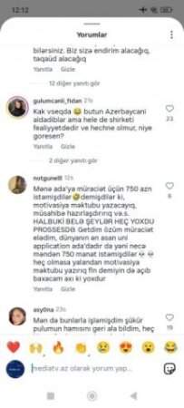 Bir müddət öncə Tribunainfo.az-a istinadən Xaricdə təhsil vədi verən “Pilgrim Education” ailələri aldatmağa davam edir” sərlövhəli məqalə dərc etmişdik və bu məqaləni Mediatv.az xəbər portalının instagram səhifəsində paylaşmışdıq.Qısa bir vaxtda Mediatv.az xəbər portalının instagram səhifəsin 71 mindən artıq baxış gəlmiş,şərh bölümündə isə 160-dan artıq fikir bildirilmişdir.Əksər izləyicilərimiz “Pilgrim Education” şirkətinin rəhbəri Aisa Aslanova tərəfindən aldanıldıqlarını və pullarının geri qaytarılmamısdan şikayətlənirlər.Onlar Aisa Aslanovanın kimlərsə tərəfindən himayə olunduğunu, ölkə prezidenti İlham Əliyevdən və Birinci vitse-prezident Mehriban Əliyevadan bu qanunazidd fəaliyyətin qarşısının alınması üçün zəruri tədbirlərin görülməsini ,onlara dəymiş maddi ziyanın geri qaytarılması üçün aidiyyatı qurumlara göstəriş verilməsini xahiş edirlər.