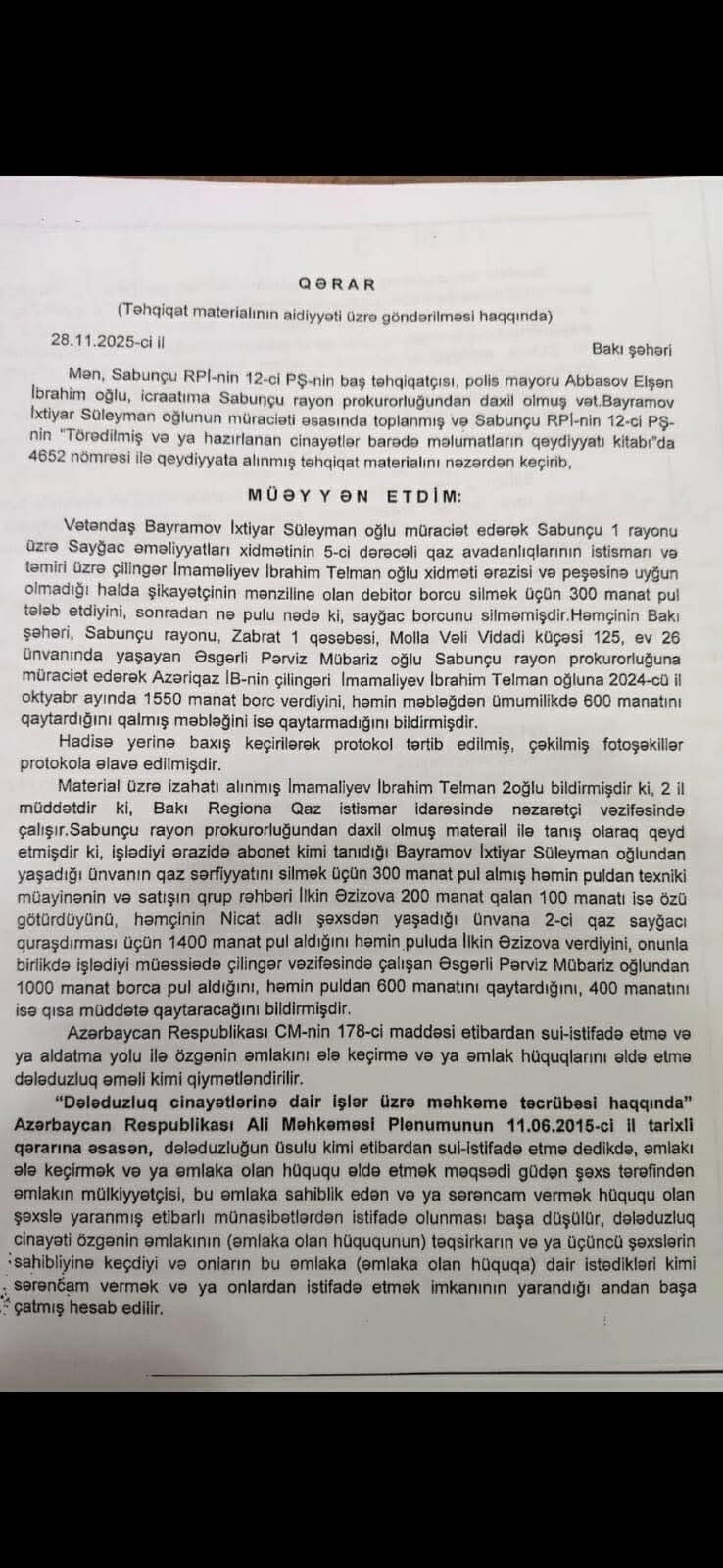 Belələrinin felinə düşən vətəndaş N.Əhmədov (ad, soyad şərtidir) aidiyyatı üzrə şikayət etməklə sübutlar təqdim etmiş və nəticədə İbrahim İmaməliyevə qarşı araşdırmalara başlanılmışdır.