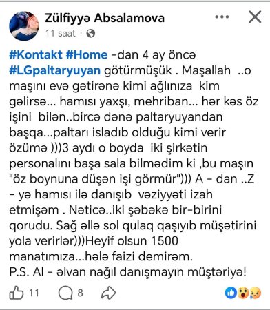 ““Kontakt Home”dan 4 ay öncə LG paltaryuyan götürmüşük. O maşını evə gətirənə kimi ağlınıza kim gəlirsə hamısı yaxşı, mehriban, hər kəs öz işini bilən idi. Bircə paltaryuyandan başqa. Paltarı isladıb olduğu kimi verir özümə. 3 aydı o boyda iki şirkətin personalını başa sala bilmədim ki, bu maşın “öz boynuna düşən işi görmür”. A-dan Z-yə hamısı ilə danışıb vəziyyəti izah etmişəm. Nəticədə iki şəbəkə bir-birini qoruyur.