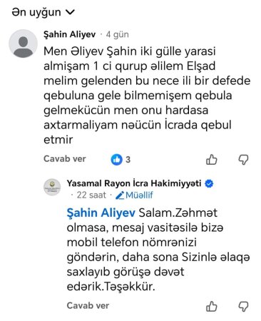 “Şahin Aliyev, zəhmət olmasa, mesaj vasitəsilə bizə mobil telefon nömrənizi göndərin, daha sona Sizinlə əlaqə saxlayıb görüşə dəvət edərik” – deyə, icdadan bildirilib.