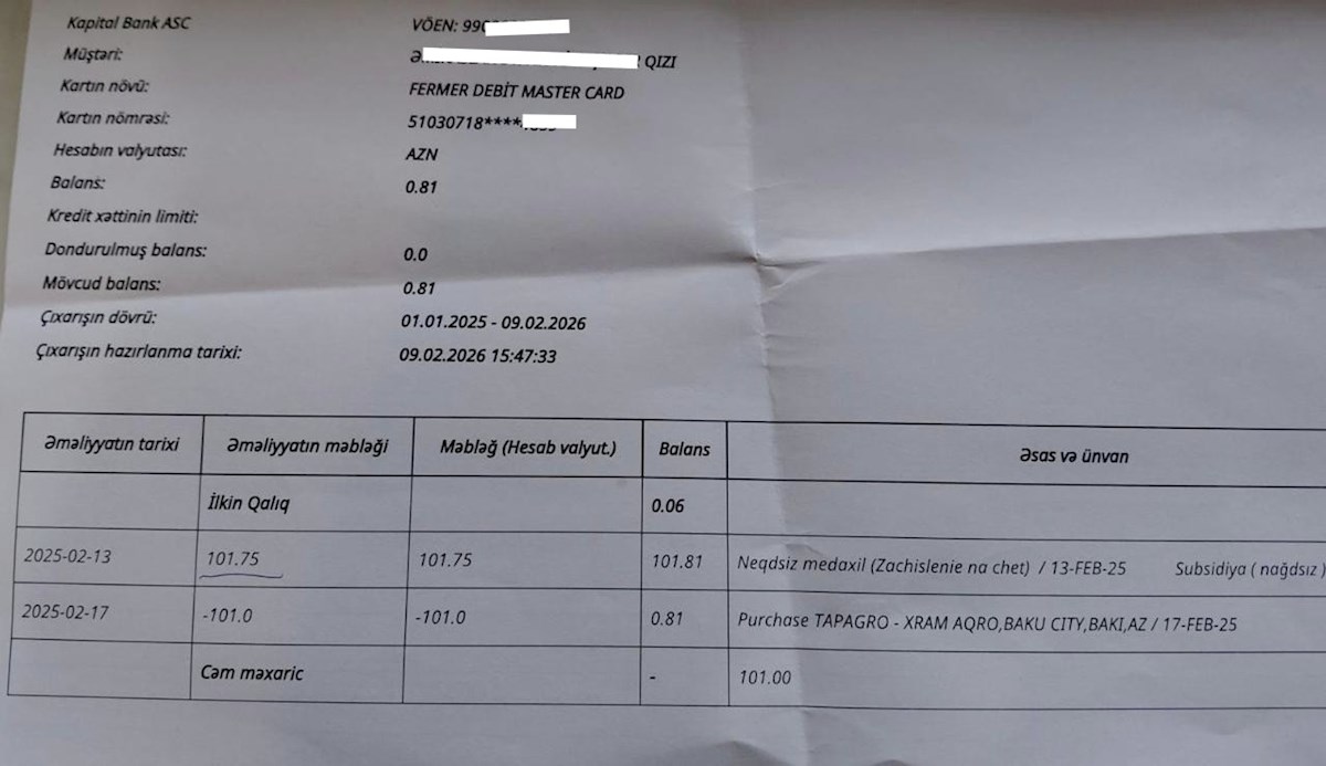 Redaksiyamıza təqdim olunan bank çıxarışlarında aydın görünür ki, fermerlərin kartına “subsidiya” adı ilə köçən vəsaitlər (məsələn, 37.95 AZN və 101.75 AZN kimi məbləğlər) bir neçə gün sonra “TAPAGRO-XRAM AGRO” şirkəti tərəfindən “satınalma” əməliyyatı ilə silinib. Atanın iddiasına görə, bu, kütləvi xarakter daşıyır və minlərlə fermerin kartı bu üsulla boşaldılıb.