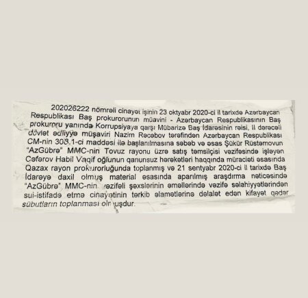 O, “AzGübrə” MMC-nin Tovuz rayonu üzrə satış müdiri Habil Cəfərovun və Ağstafa rayon Aqrolizinq idarəsinin rəhbər vəzifəli şəxsi Cavanşir Əmrahovun adını çəkərək, onların öz vəzifə səlahiyyətlərindən sui-istifadə etdiklərini bildirir.