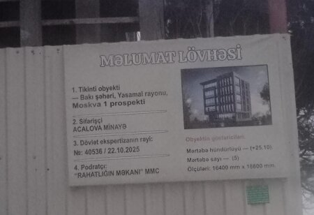 Məlumata görə, səkidə hündürlüyü 25 metrdən yüksək olan 5 mərtəbəli obyekt tikilir. Sifarişçinin fiziki şəxs Minayə Acalova olduğu qeyd edilib. Podratçı şirkət isə “Rahatlığın Məkanı” MMC-dir.