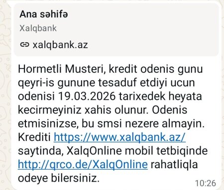 "Bildiyiniz kimi ayın 20-30 aralığı bayramlarla əlaqədər qeyri-iş günüdür. Banklar isə insanların bayramlarını qara bayrama çevirmək istəyirlər. Banklar kredit ödənişi bu günlərə düşən müştərilərindən ödənişlərini qabaqcadan ayın 19-zu ödənilməsini tələb edirlər..." "DİA-AZ" xəbər verir ki, bunu "AzBank Klubu" sosial qrupundakı paylaşımında Nemət Zakirov adlı istifadəçi qeyd edib.