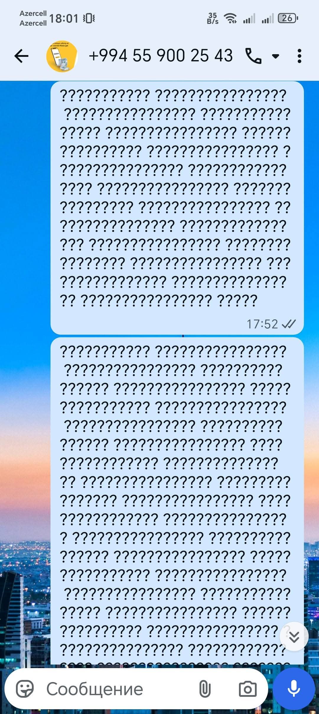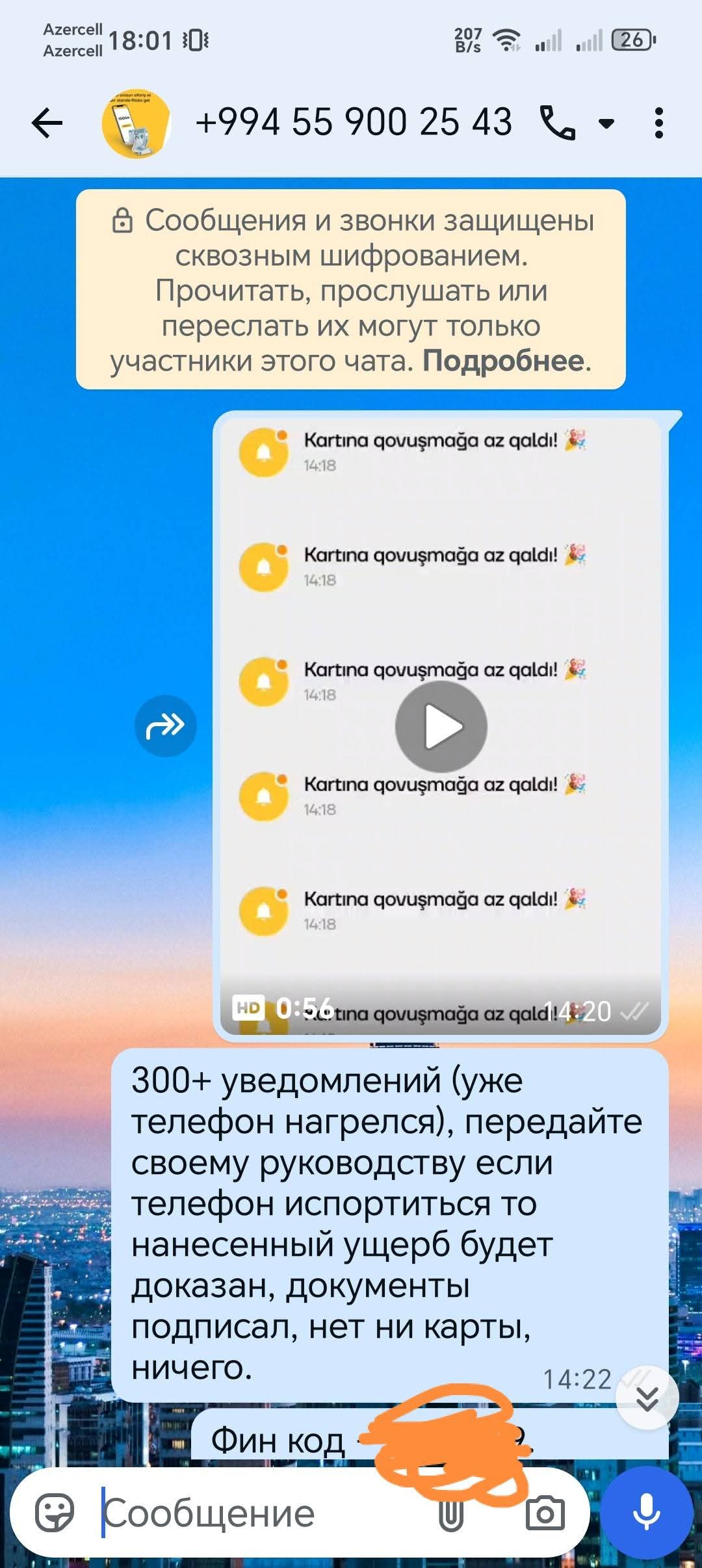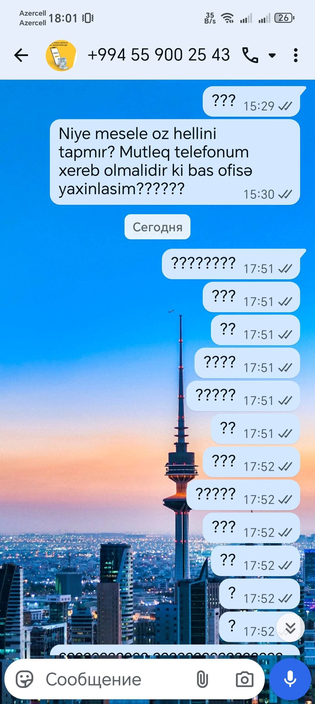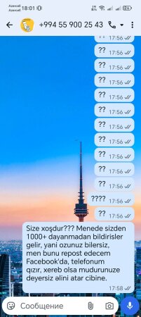 Buradan "Yelobank"ay səslənirəm: əgər telefonum bu bildirişlərə görə xarab olsa, sizin baş ofisinizə gələcəm. Zəhmət olmasa, rəhbərliyinizə deyin ki, əlləri cibində olsun. Mən təsəvvür edə bilmirəm, Əgər bu "Yelobank" yeni bir müştərisinə belə bir problem yasadarsa, bunun gələcəkdə işləri necə olacaq?