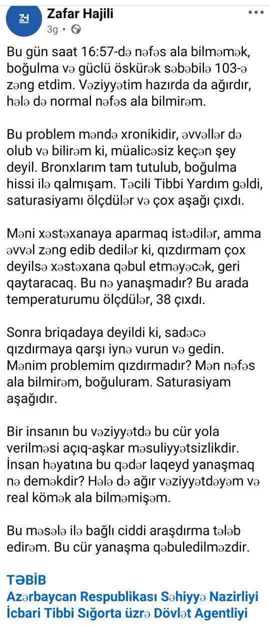 "Bir insan üç gün öncə status yazır, səhhəti ilə bağlı narahatlığını dilə gətirir, nəfəs ala bilmədiyini deyir və buna baxmayaraq, təcili tibbi yardımın onu xəstəxanaya aparmadığını bildirir. Üstəlik aidiyyəti qurumları da paylaşımına işarələyir. Və heç bir reaksiya olmur, adam üç gün sonra vəfat edir!.." "DİA-AZ" xəbər verir ki, bunu jurnalist Emin Səfərov "Qarabağ" azarkeşi kimi tanınan Zəfər Hacılının vaxtsız vəfatına və xəstə olmasına rəğmən aidiyyatı qurumlar tərəfindən göstərilən biganəliyə etiraz olaraq yazıb.