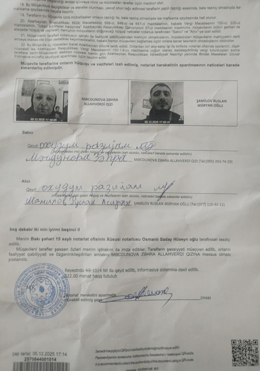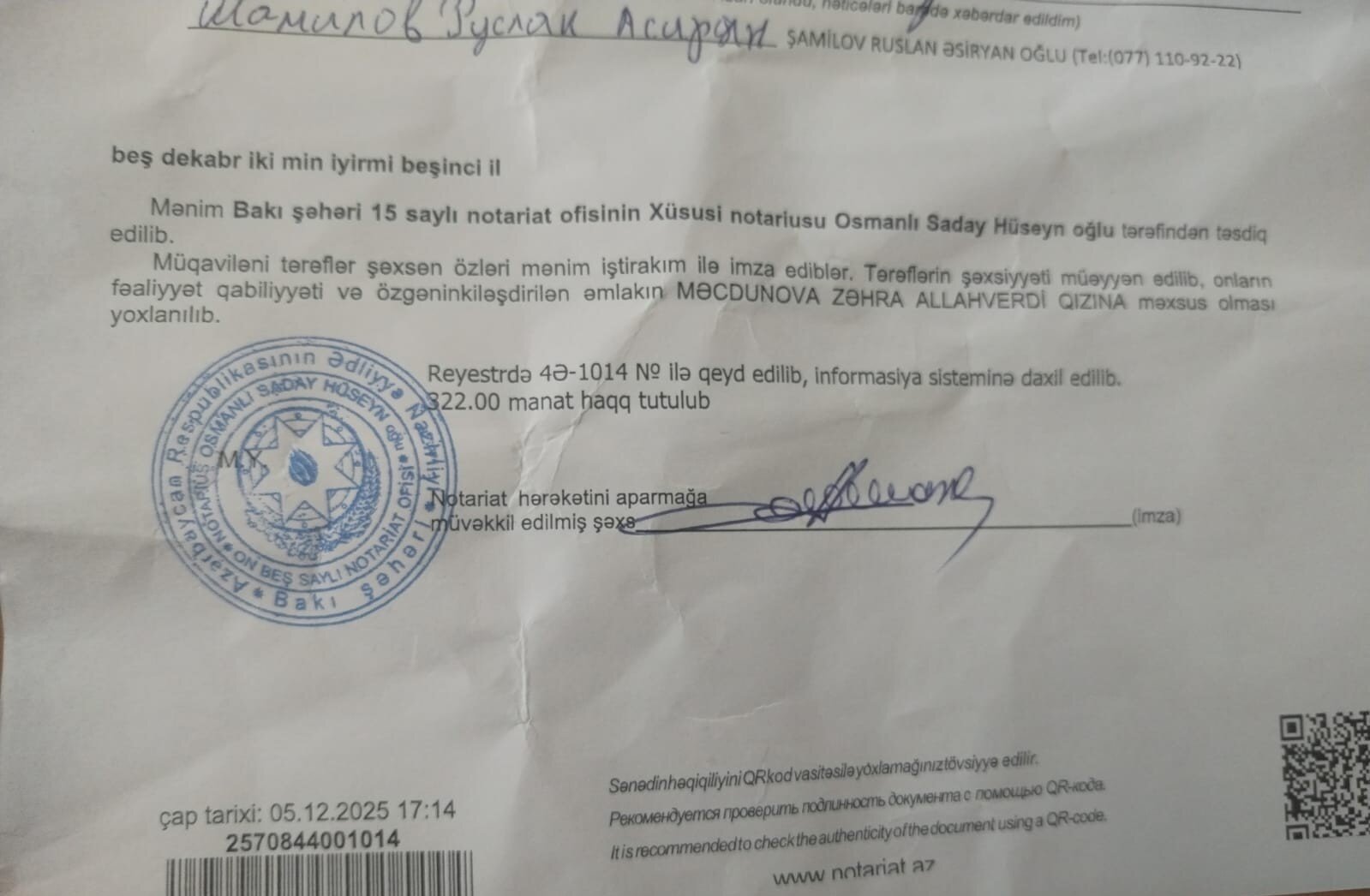 Notariusda əvvəl alacağımız puldan evi girov qoyduğum “Kəpəz” qeyri-bank təşkilatına olan 23 min manatı ödədilər. Notarius sanki özlərinin yaxını idi. Bir sənədin dalınca nə qədər adam getmişdik. Ev mənim anamın adına olduğu halda bütün sənədləşmələri özləri həll edirdilər.