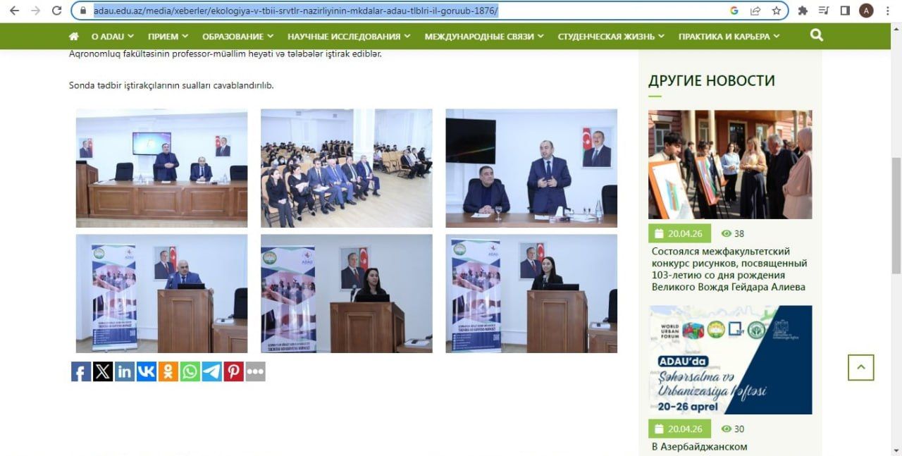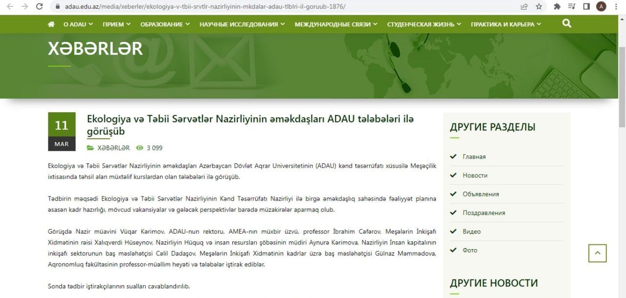 Ancaq 11 mart 2022-ci ildə Azərbaycan Dövlət Aqrar Universitetinin (ADAU) kənd təsərrüfatı, xüsusilə Meşəçilik ixtisasında təhsil alan müxtəlif kurslardan olan tələbələrlə Gəncədə Ekologiya və Təbii Sərvətlər Nazirliyinin əməkdaşlarının görüşü keçirilib. ADAU-nun saytından oxuyuruq ki, 11 mart 2022-ci ildə keçirilən bu görüşdə ekologiya və təbii sərvətlər nazirinin müavini Vüqar Kərimovla birgə nazirliyin Hüquq və insan resursları şöbəsinin müdiri Aynurə Kərimova da iştirak edib. Və nəinki iştirak edib, həm də öz çıxışı ilə tələbələri maarifləndirib və onun bu tədbirdə tribunada olduğunu əks etdirən görüntü də var.