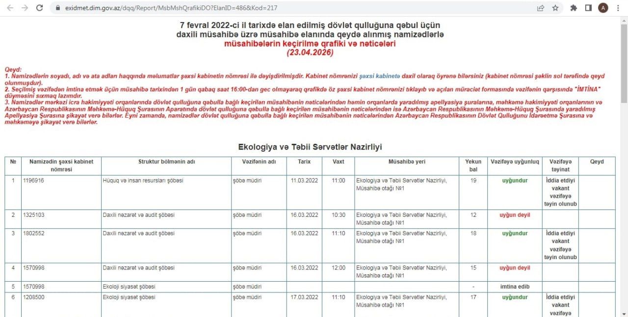 Qəribə bu deyil, hər kəsin vakansiyaya iddia etmək hüququ var. Qəribə odur ki, şöbə müdiri vəzifəsinə namizəd olan Aynurə Kərimova 11 mart 2022-ci ildə saat 11:00-da Ekologiya və Təbii Sərvətlər Nazirliyində, 1 saylı Müsahibə otağında imtahan-müsahibəyə cəlb edilir. 15 aprel 2022-ci il tarixində rəsmi nəticələr elan edilir və bəlli olur ki, A.Kərimova 19 bal toplayıb və vəzifəyə uyğundur. Onun vəzifəyə uyğunluğu təsdiqlənəndən sonra iddia etdiyi vəzifəyə təyin olunub.