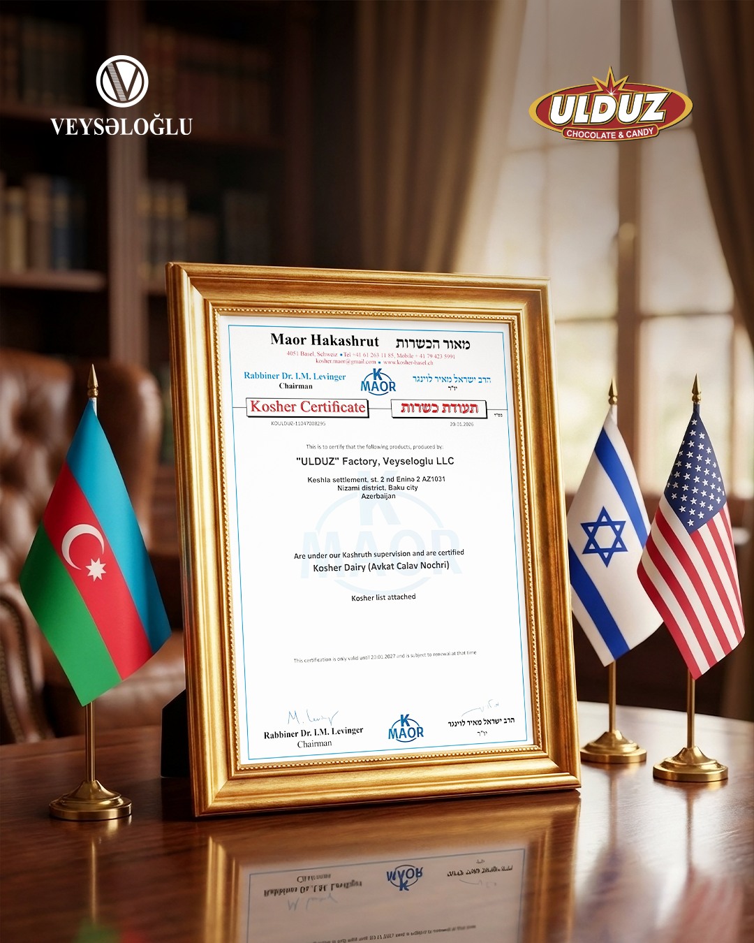 Veysəloğlu Şirkətlər Qrupuna daxil olan "Ulduz" Şokolad Fabriki növbəti mühüm beynəlxalq uğura imza atıb. Belə ki, müəssisə KOSHER sertifikatı əldə edib. Bu sertifikat "Ulduz" Şokolad Fabrikində istehsal olunan məhsulların beynəlxalq KOSHER tələblərinə tam uyğunluğunu təsdiqləməklə yanaşı, şirkətdə formalaşmış yüksək keyfiyyət və qida təhlükəsizliyi standartlarının bariz göstəricisidir.